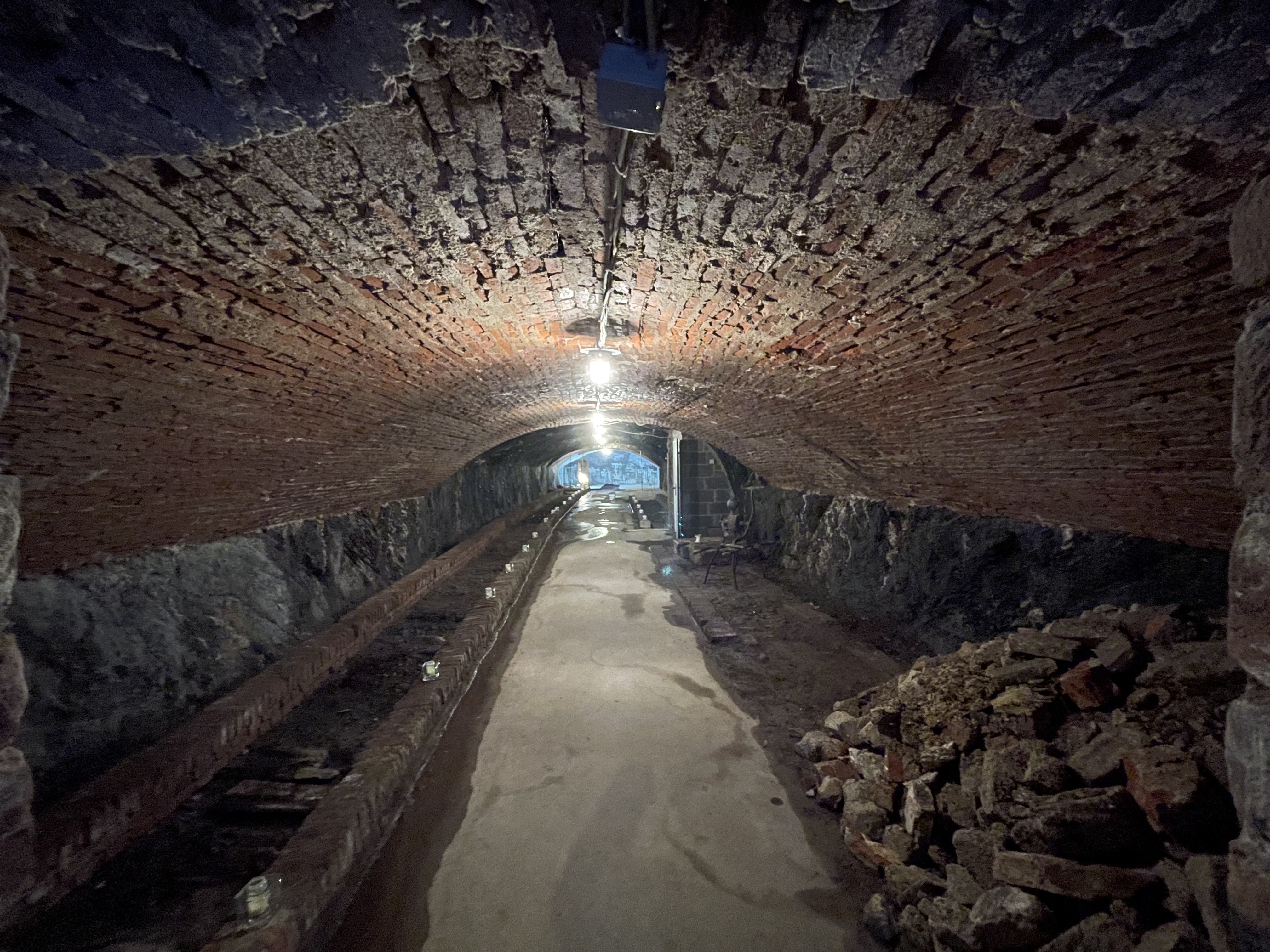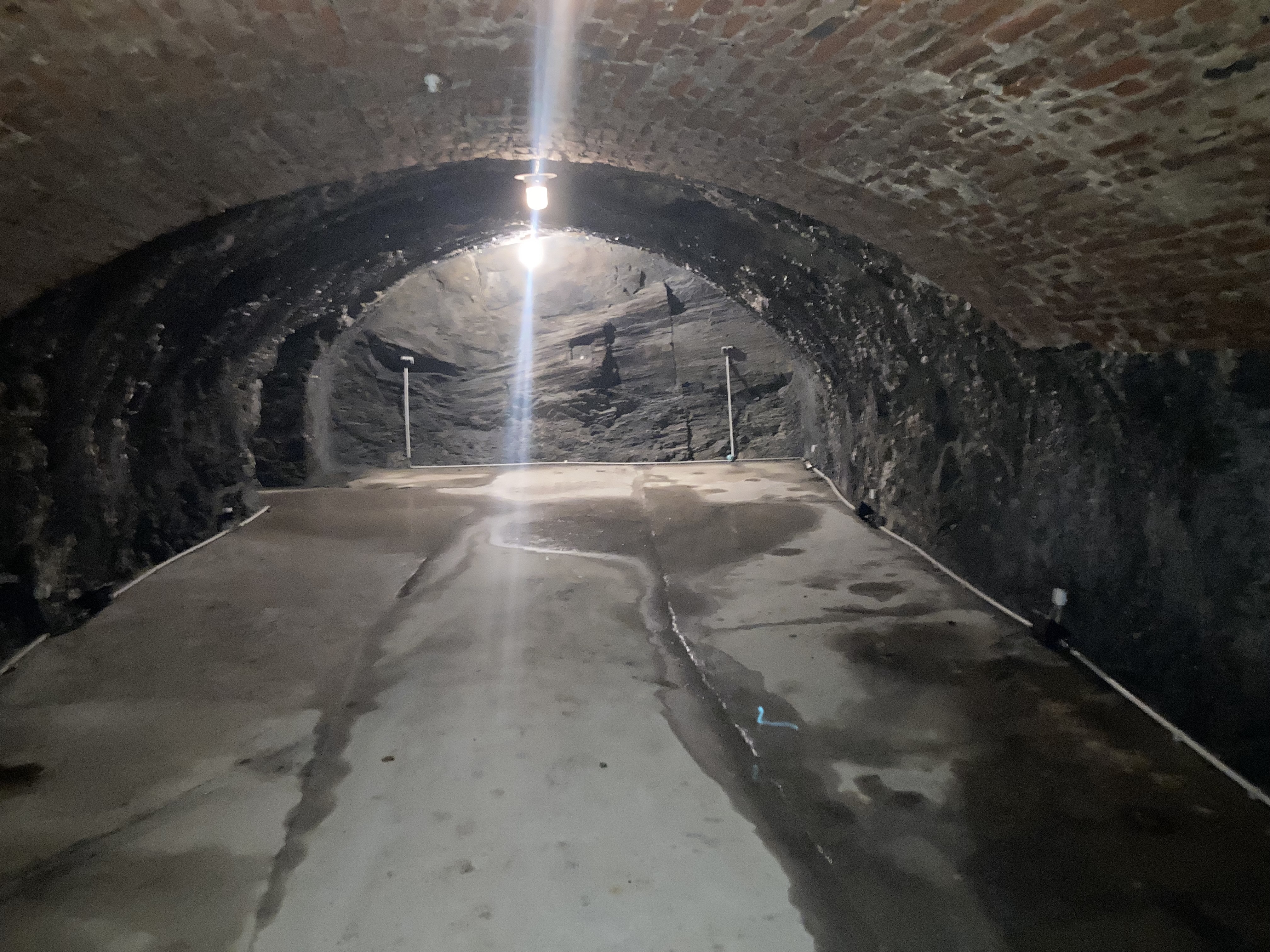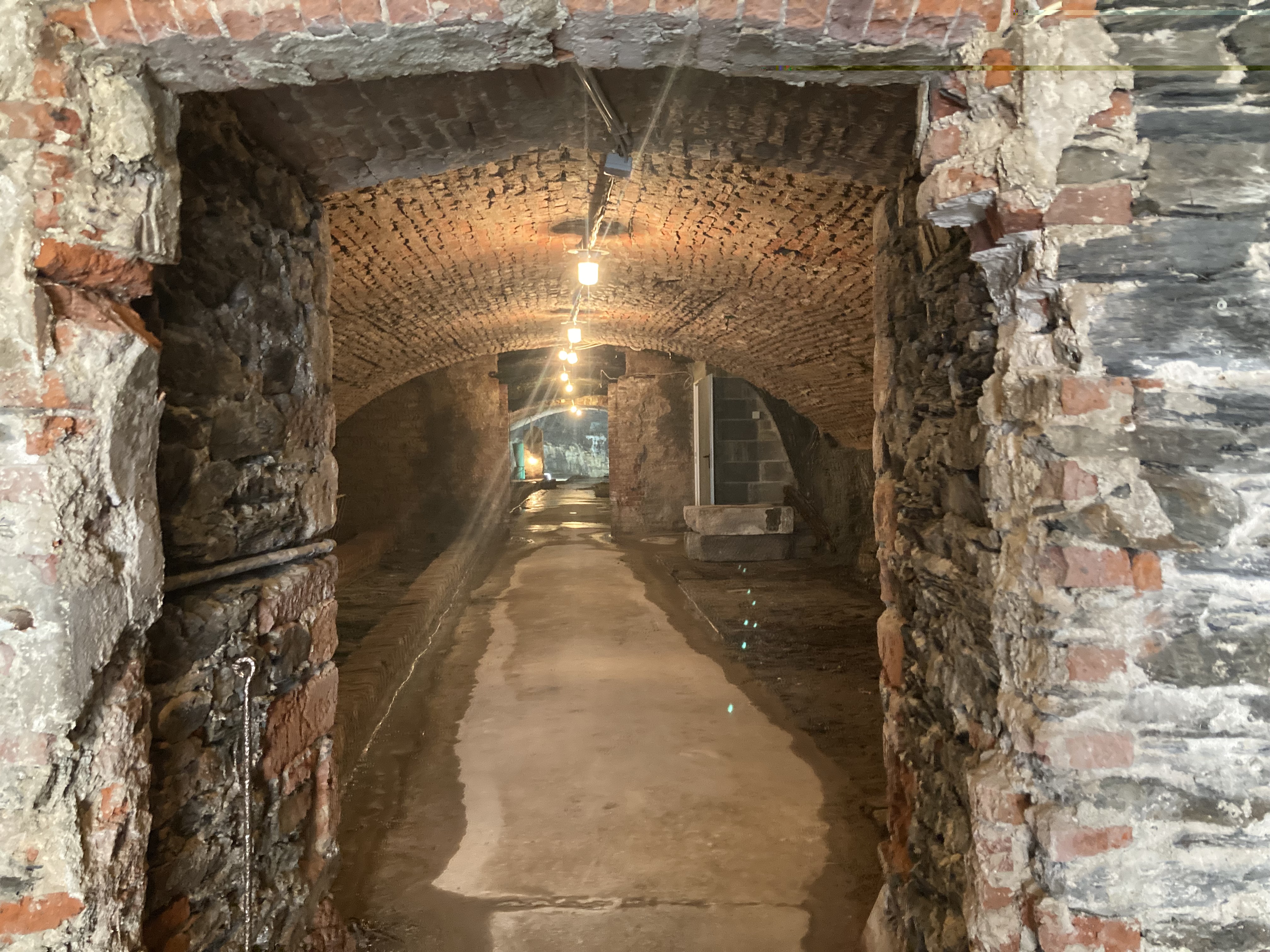 Beeindruckend sind die hellen Quarziteinlagerungen im dunklen Naturschiefer sowie die Verstärkung des Gewölbes an mehreren Stellen durch untergezogene Backsteine.
