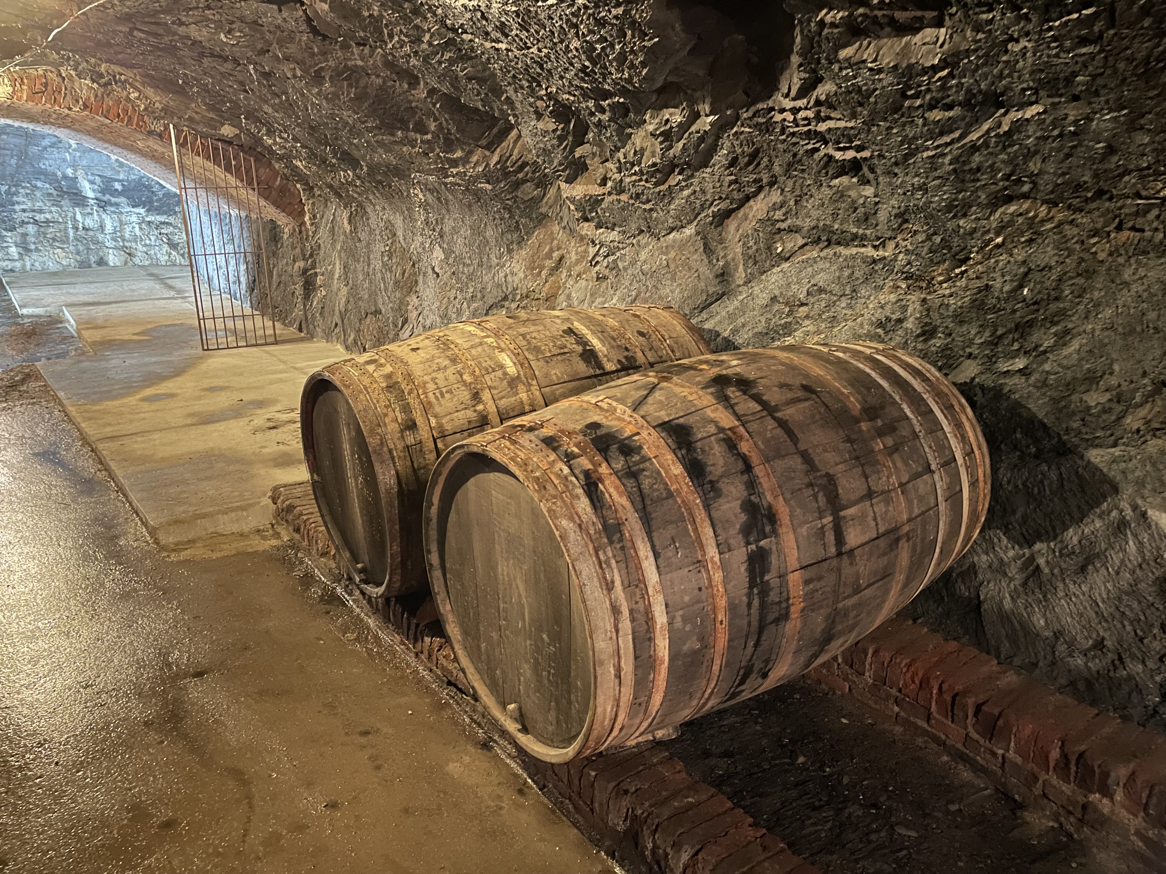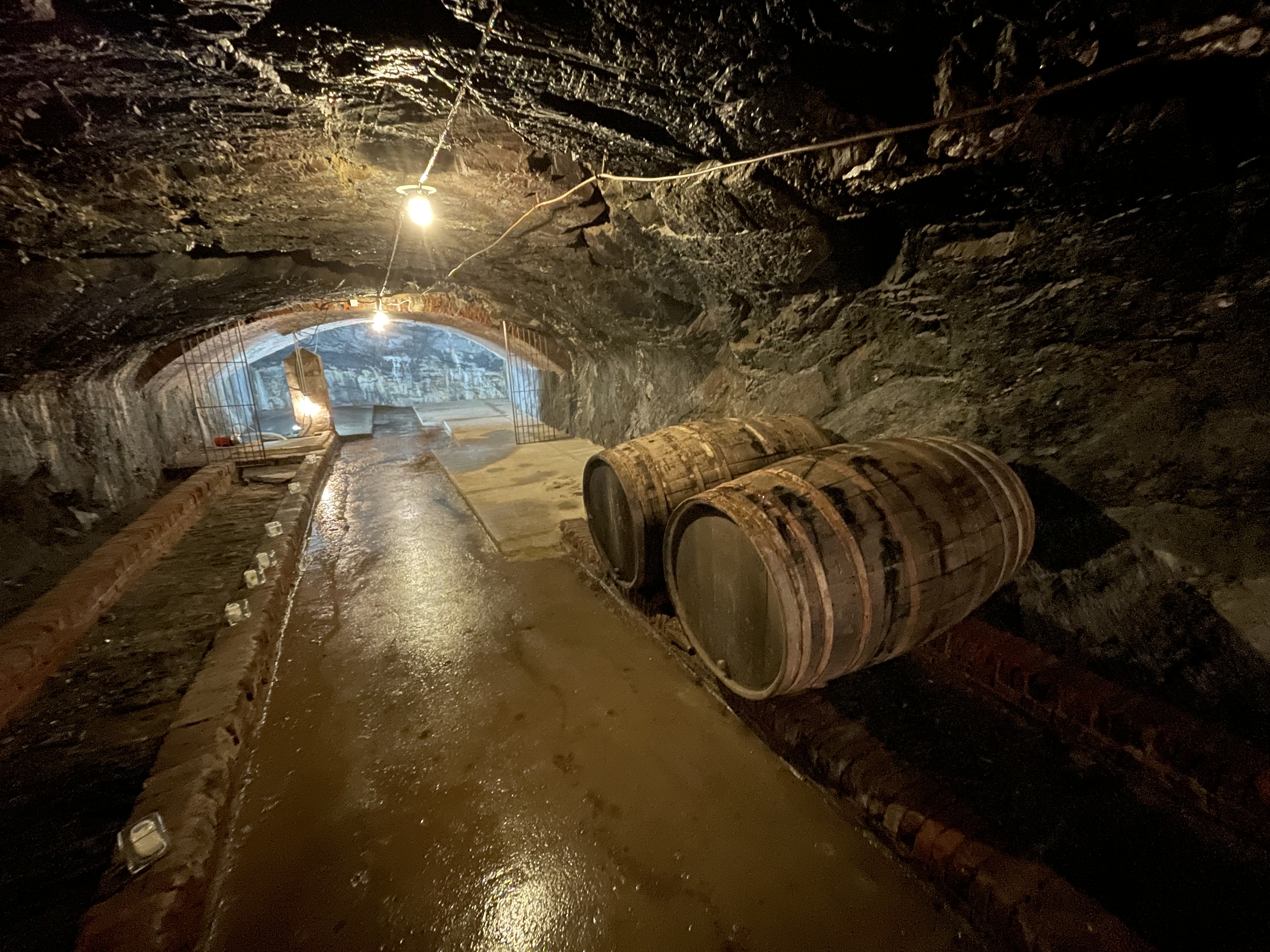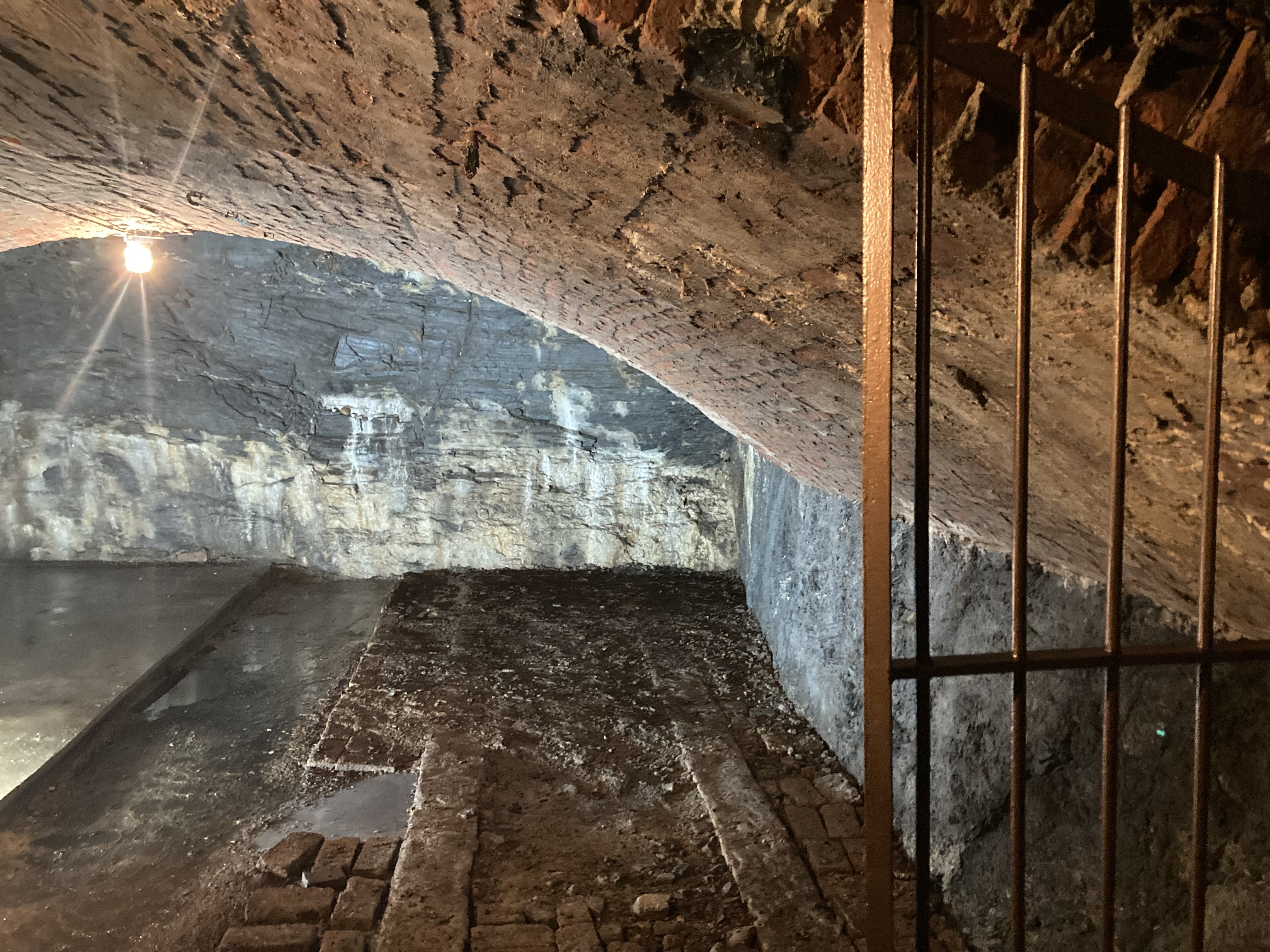 Beeindruckend sind die hellen Quarziteinlagerungen im dunklen Naturschiefer sowie die Verstärkung des Gewölbes an mehreren Stellen durch untergezogene Backsteine.