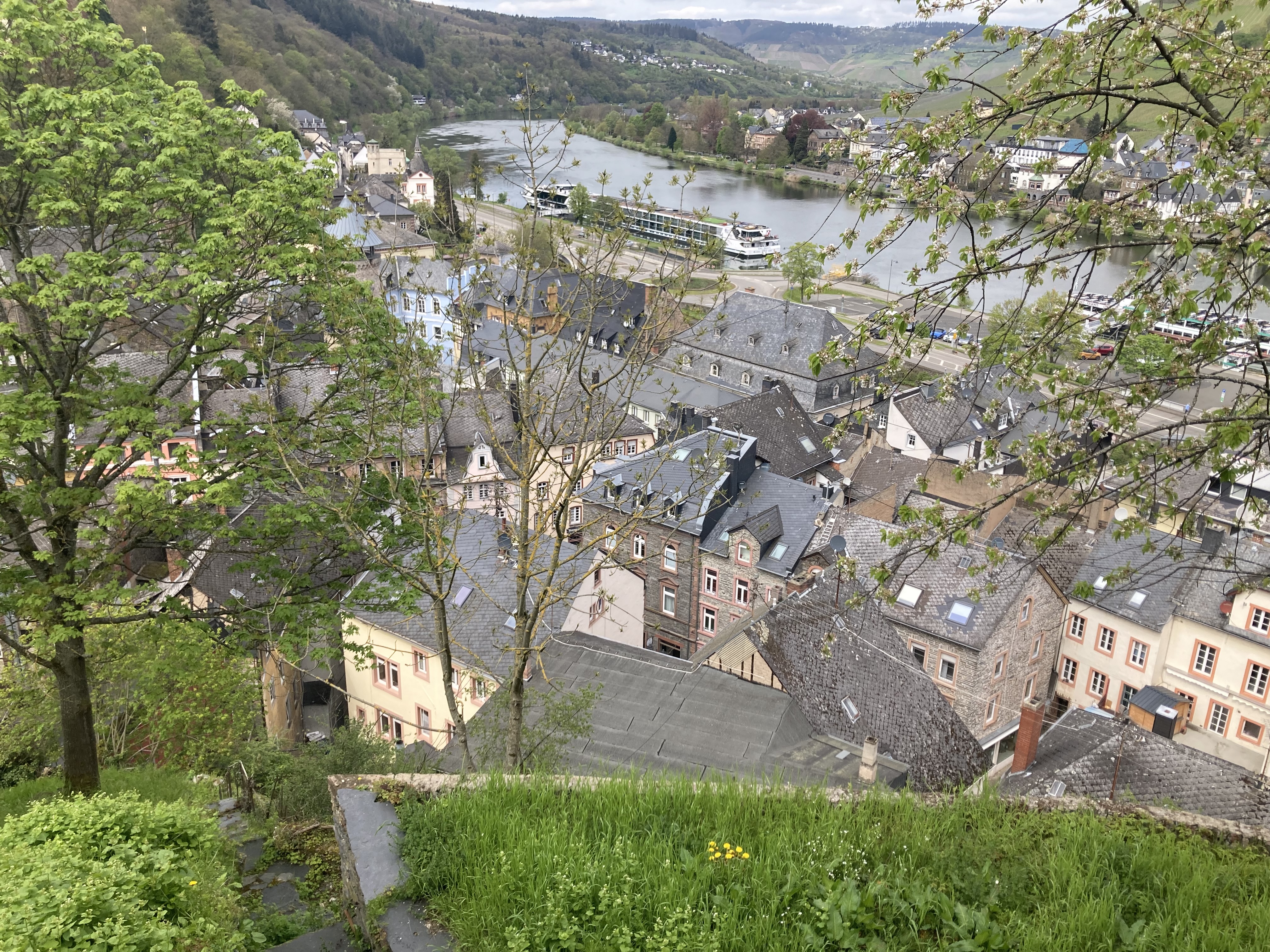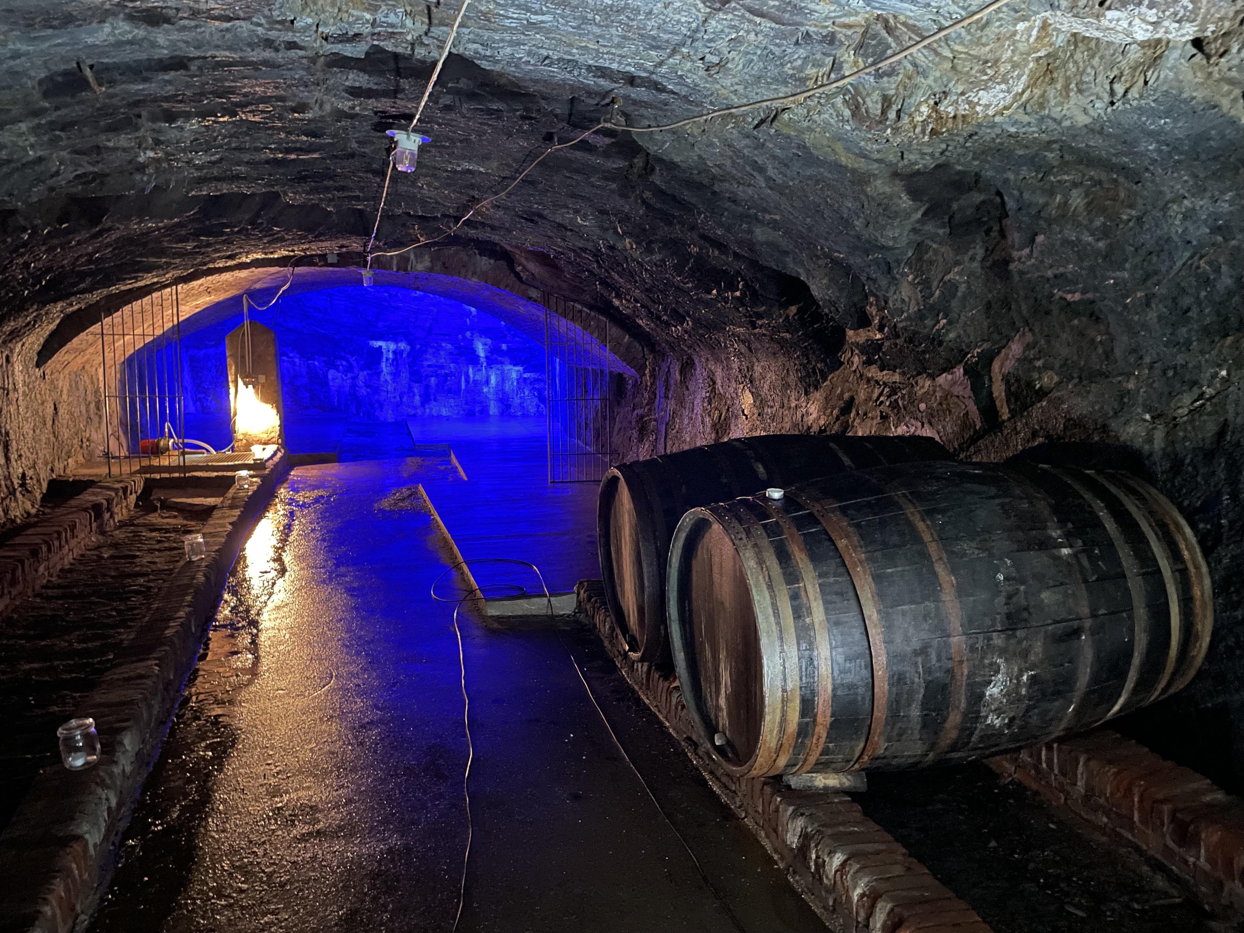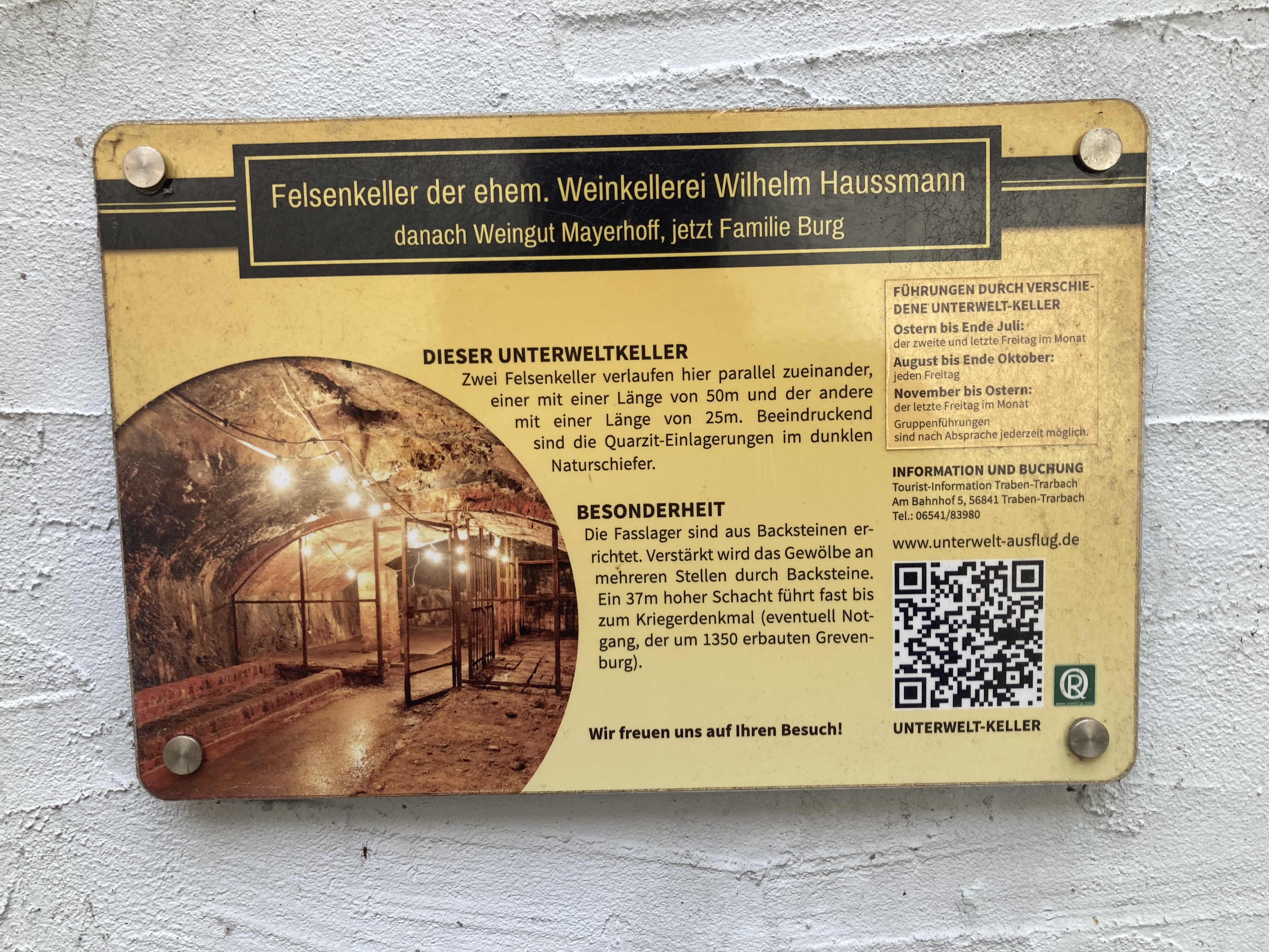 Auf oberen Fotos sieht man den Eingang zum Felsenkeller und auch den Ausgang des 37m langen Schachts zum Garten oberhalb des Kellers. Man hat von dem Garten auch einen sehr schönen Ausblick auf Traben-Trarbach und die Mosel.